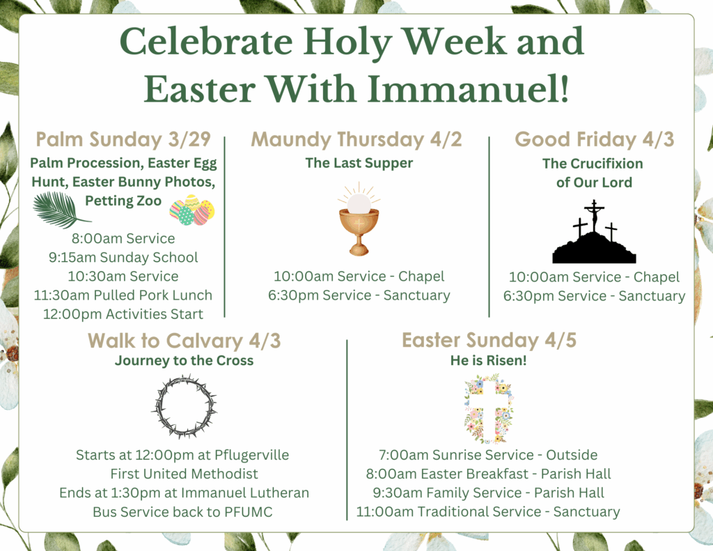 GATHER and discover community, GROW in faith, and SERVE together at Immanuel Lutheran Church.